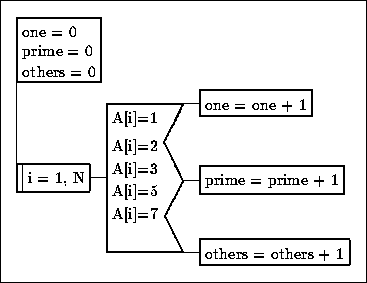 { one = 0 prime = 0 others = 0 } for(i = 1, N){ switch(A[i]){ case 1: one = one + 1 case 2: case 3: case 5: case 7: prime = prime + 1 default: others = others + 1 } }