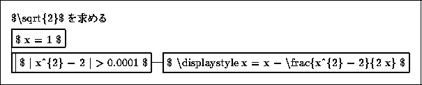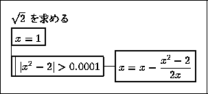 /* pad2ps: texmode = latex */ { /* pad2ps: message = $\sqrt{2}$ を求める */ $ x = 1 $ while ( $ | x^{2} - 2 | > 0.0001 $) { $ \displaystyle x = x - \frac{x^{2} - 2}{2 x} $ } }