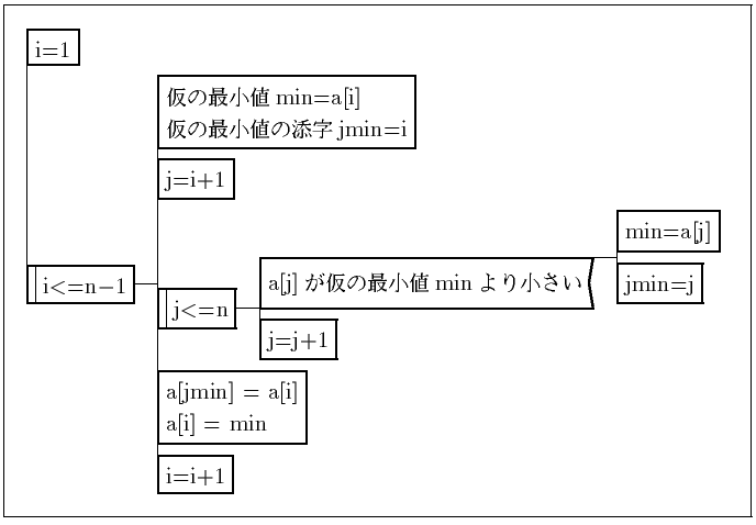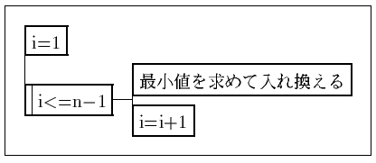 課題1 データを小さい順(昇順)にソートするアルゴリズム 大枠を 図-1 に示す。この [最小値を求めて],[入れ換える] の部分を さらに詳細にすると 図-2, 図-3 のようになる。 アルゴリズム全体をまとめると 図-4 のようになる。 図-1 処理の大枠図-2 最小値を求める
