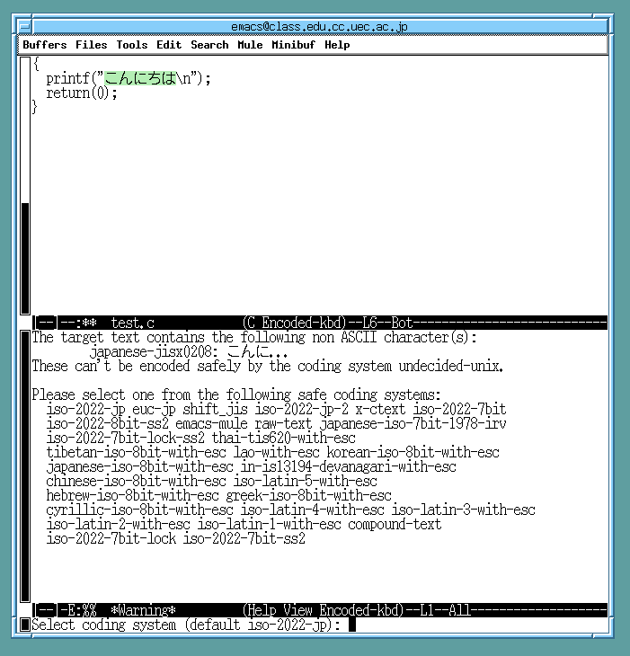 P.21 で, 表示する文字列を日本語に変えてみるところがある. emacs で日本語を含むファイルを保存しようとしたときに, 下図のようなメッセージが表示されて, 保存がうまくいかないことがある. このばあいには, エコーエリア(emacs の最下行, いまカーソルのある場所)に 「