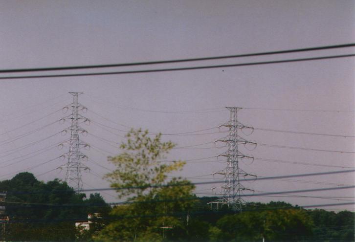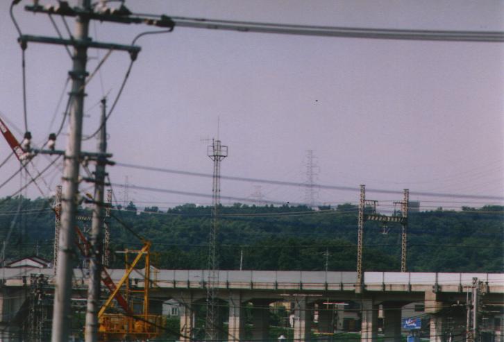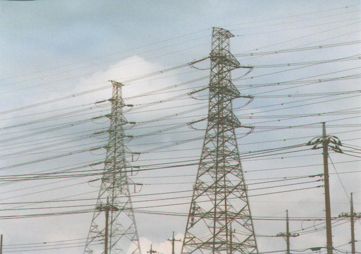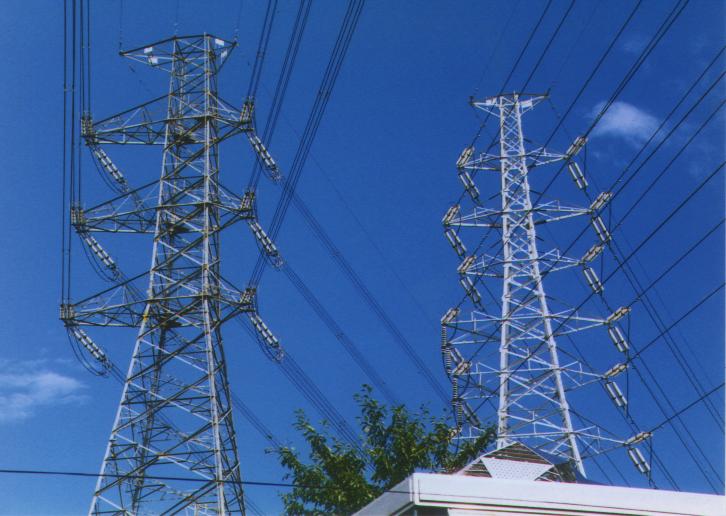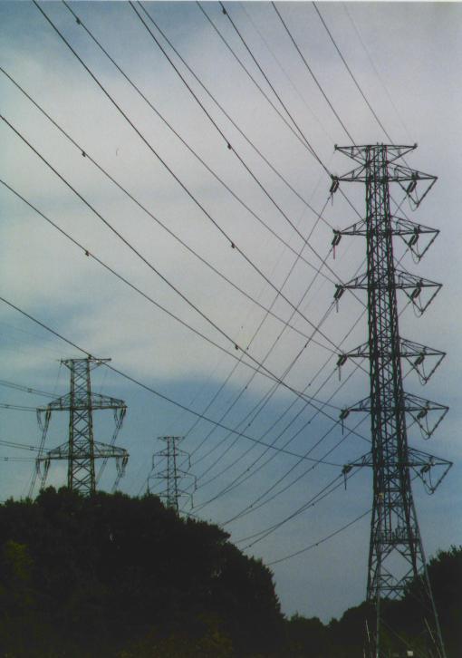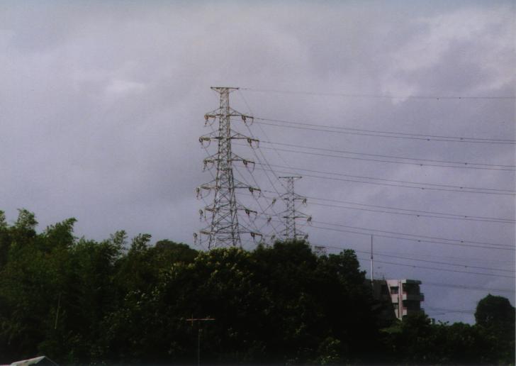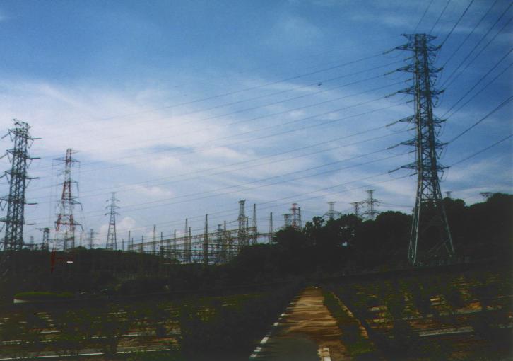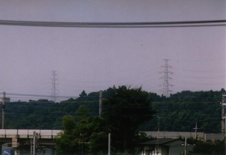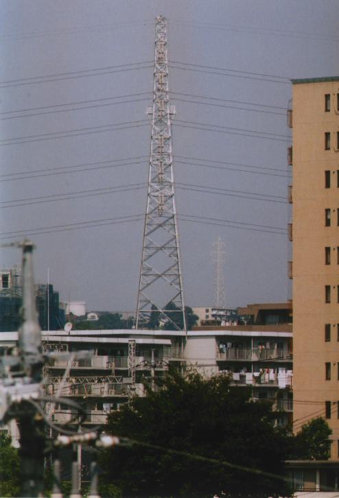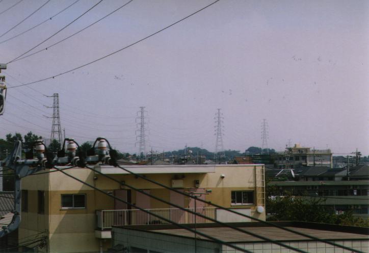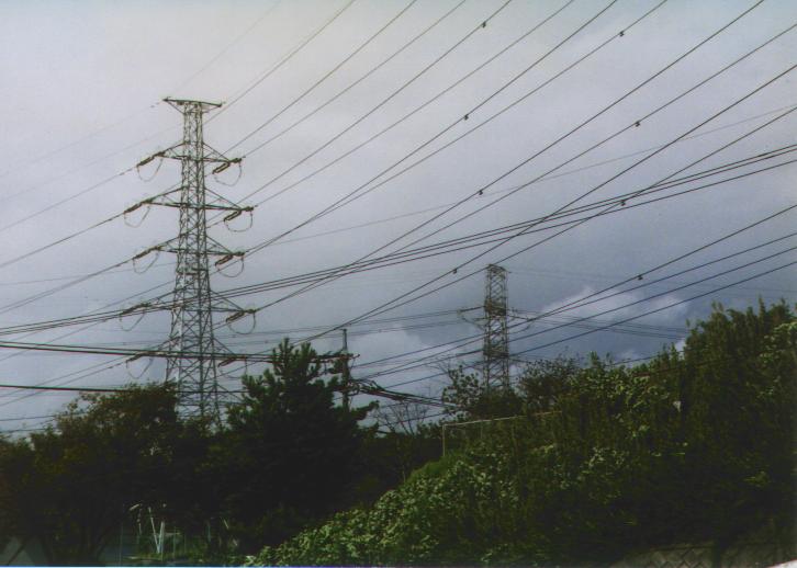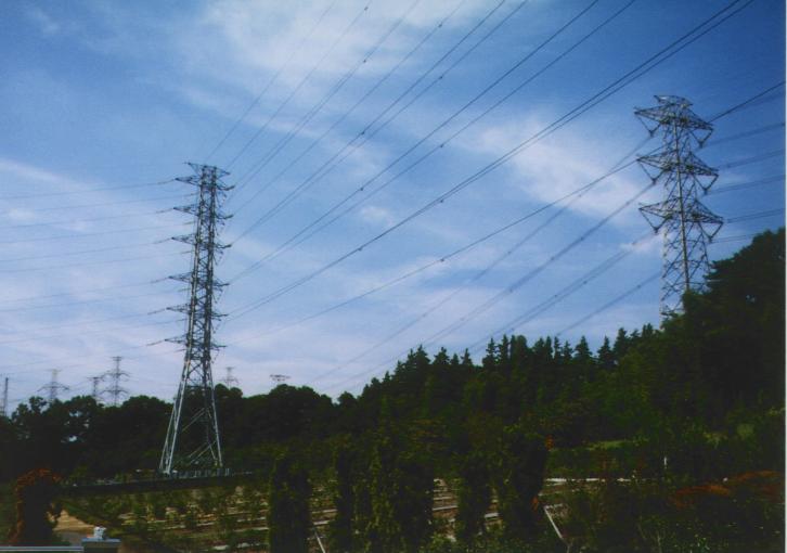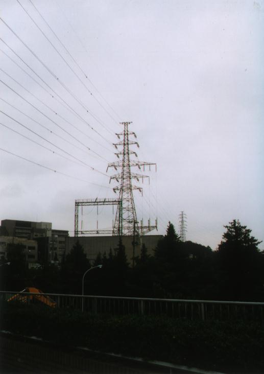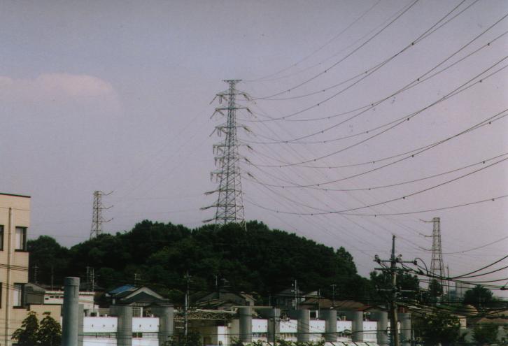 柿生線 1(中央, 背の低い鉄塔), 2(右手の背の高い鉄塔) 号基 と 港北線 1 号基(左側一番大きく写った鉄塔)