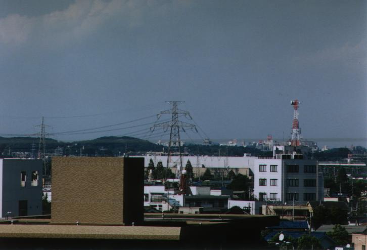 かすかに対岸の 27? 号基の頂部が左の建物のすき間に覗く