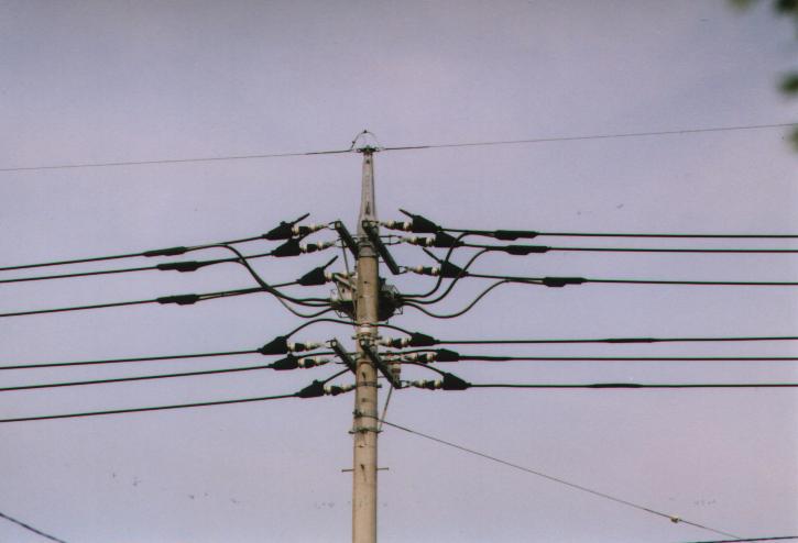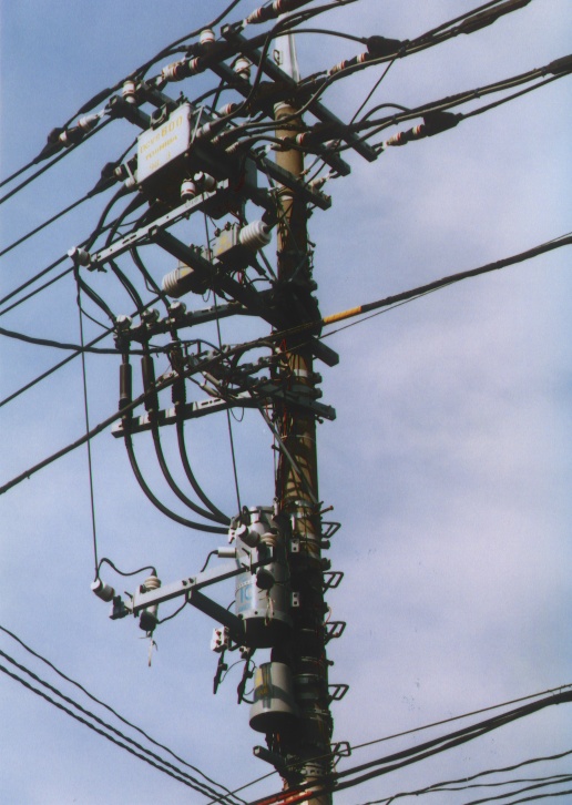下の写真のように下段の高圧配電線が高圧開閉器で区分されている。