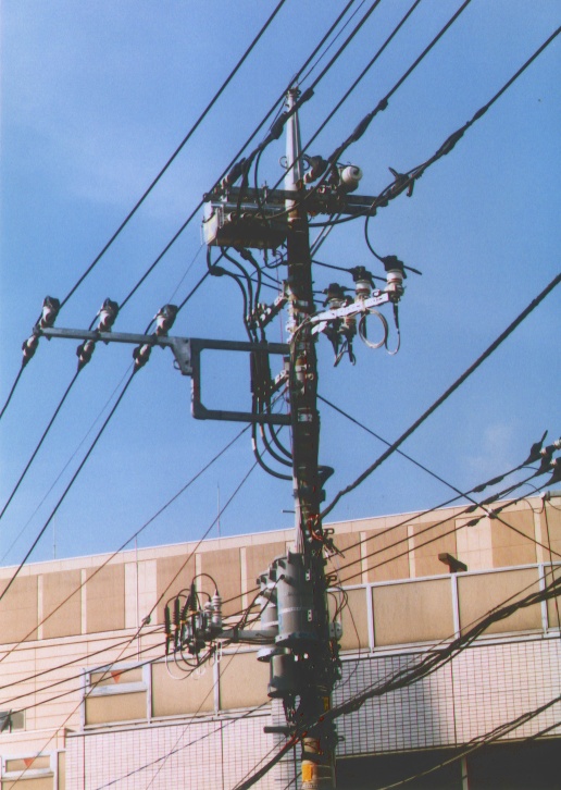 蛇足ながら、ここから立ち上がり電柱まで、 上段の高圧配電線に接続される負荷はひとつもない。 いや、 これは蛇足なんかじゃなく、 凄く重要なことなんじゃないだろうか。 今まで何となく、 フィーダ区間とは地下ケーブル区間のことのような気がしていたのだけれど、 上段の高圧配電線にとっては、 下段の高圧配電線に接続される電柱 A までがフィーダ区間なのだ。